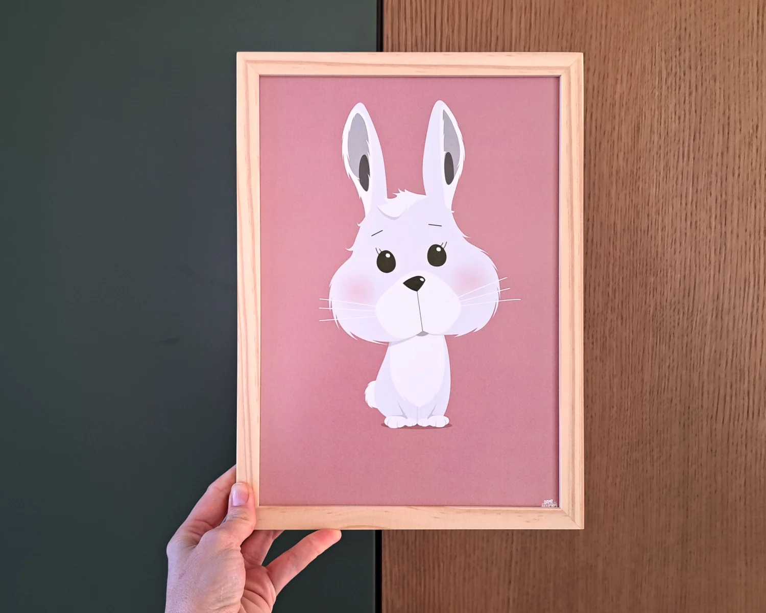 Cette affiche lapin chambre bébé représente un petit lapin au style tendre et expressif, dans la continuité des autres animaux mignons de la collection.
