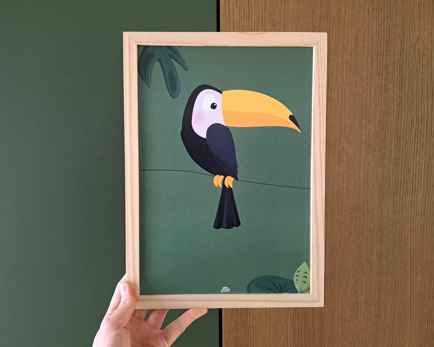 Cette affiche toucan chambre bébé représente un oiseau tropical attachant au regard curieux et malicieux. Les formes douces et les couleurs équilibrées rendent l’illustration particulièrement chaleureuse et adaptée à l’univers de l’enfance.