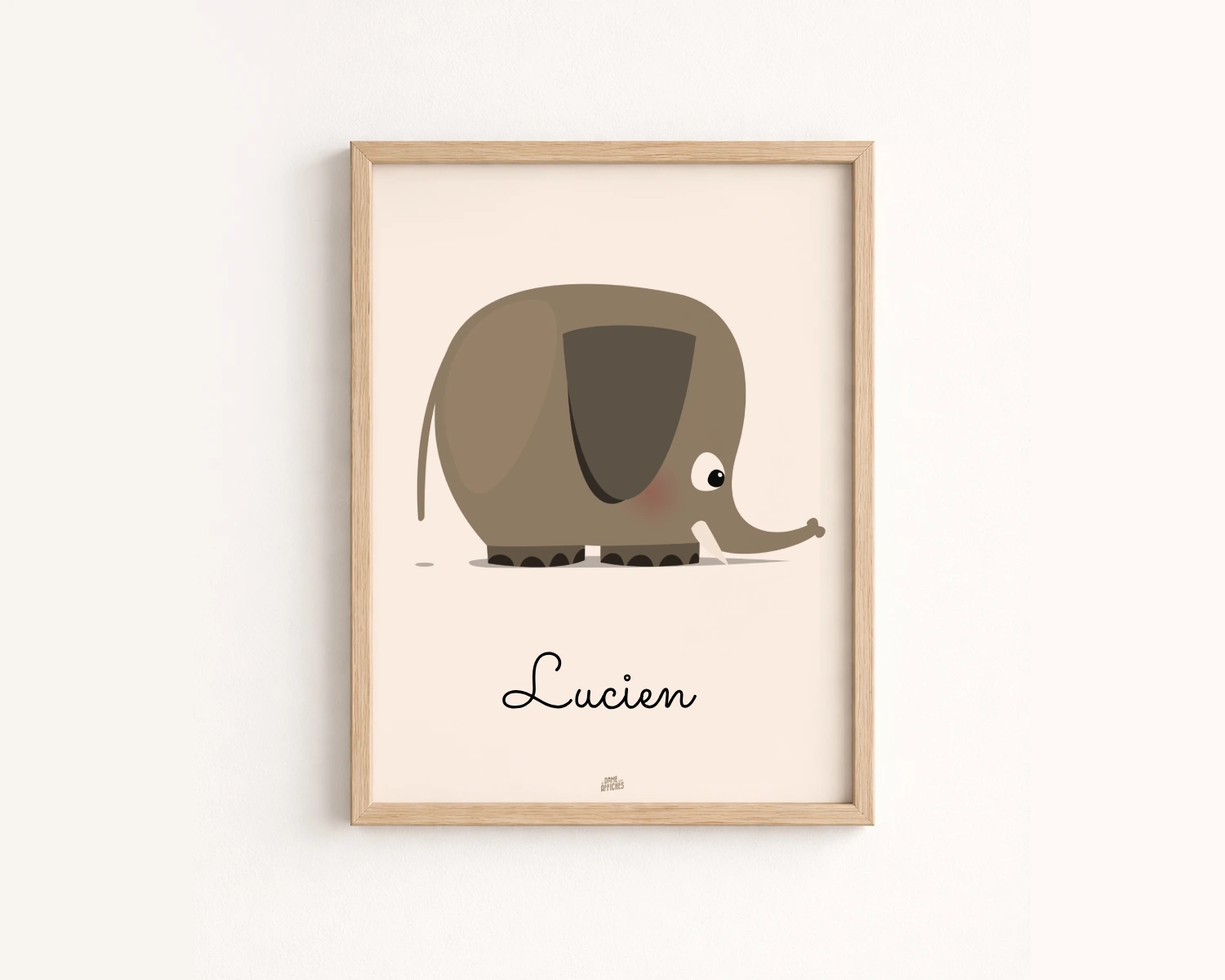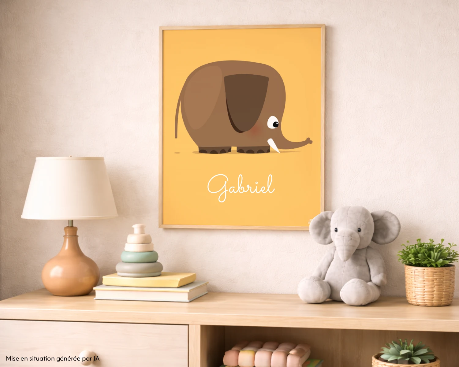 Pour personnaliser votre affiche éléphant, indiquez simplement le prénom (ou surnom) dans le champ « Personnalisation ».