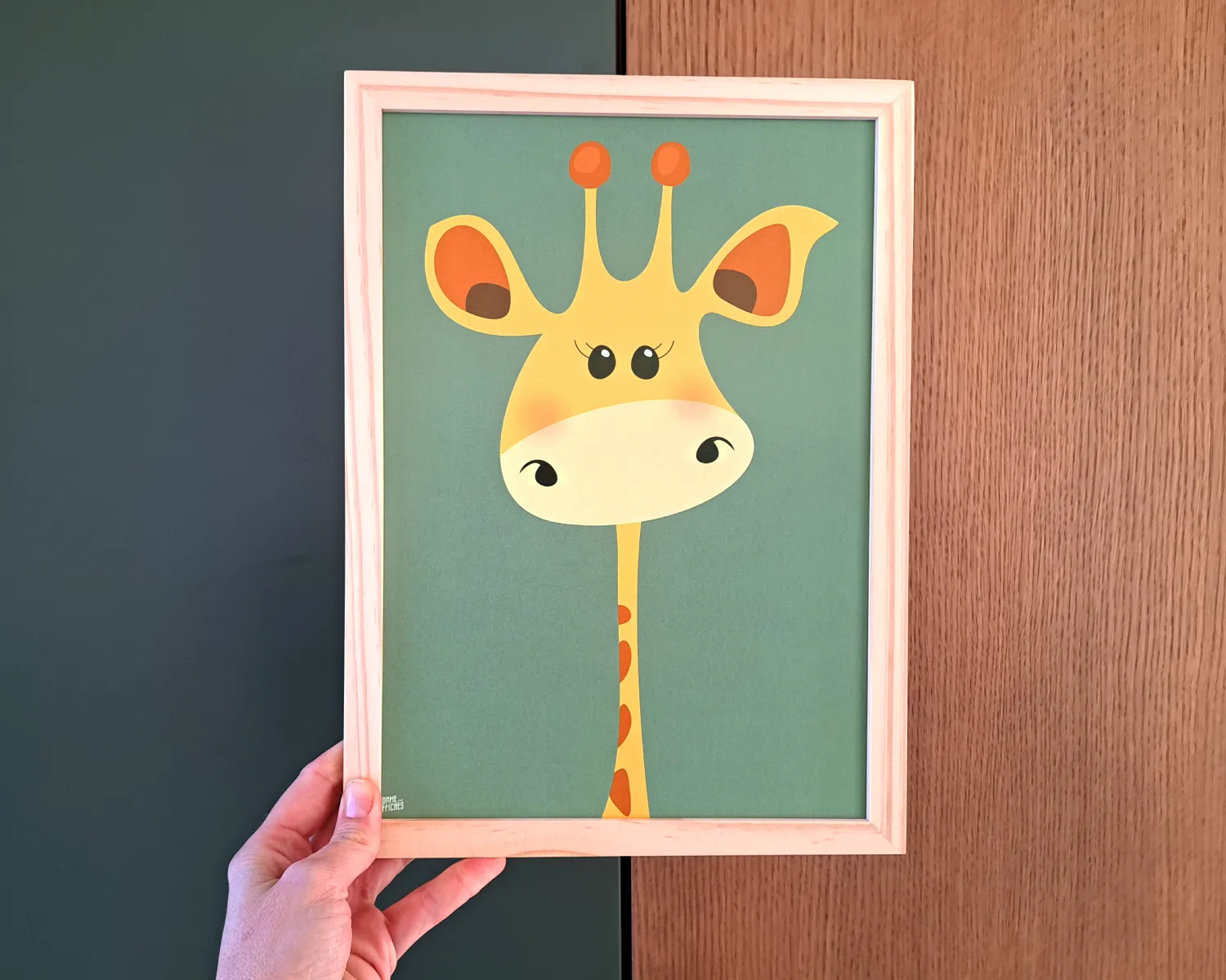 Apportez une touche de fantaisie et de bonne humeur à la chambre de votre enfant avec cette affiche girafe chambre bébé inspirée de l’univers de la savane. Cette illustration met en scène une girafe au style graphique original et légèrement décalé, qui attire immédiatement l’attention avec sa grande tête expressive et son long cou tacheté.