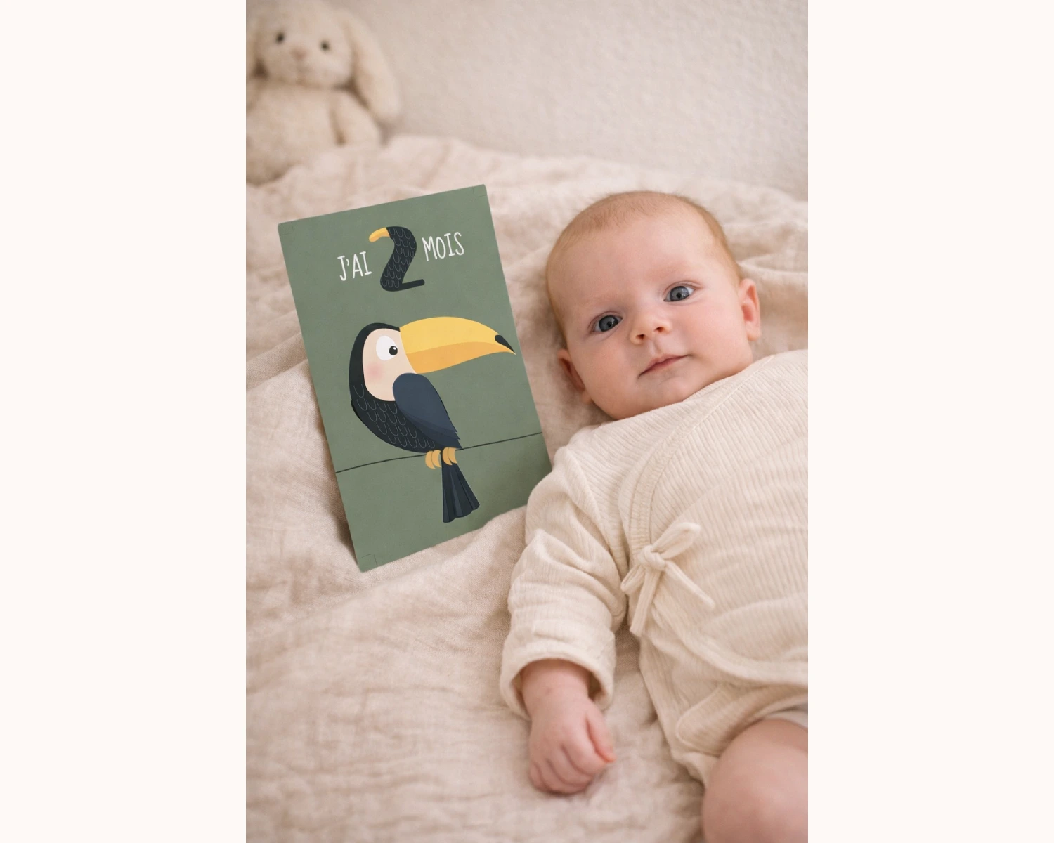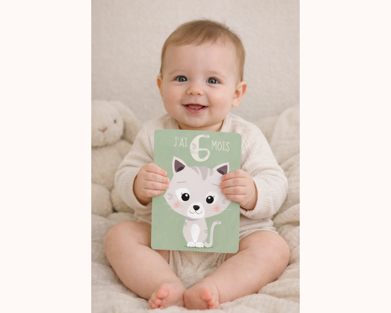 Ces cartes étape bébé personnalisées permettent de photographier chaque mois de la première année et de conserver un souvenir précieux de l’évolution de votre enfant.