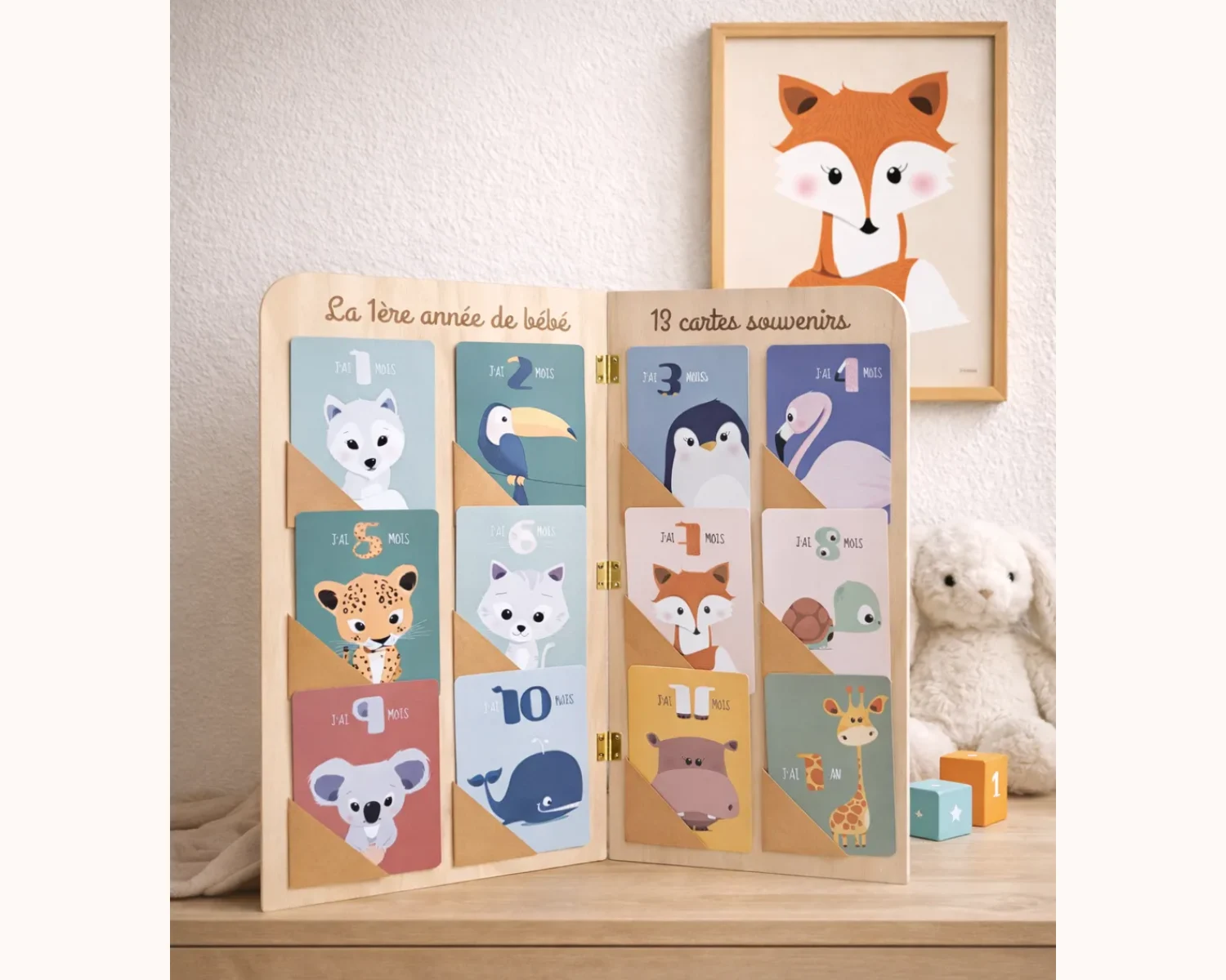 Cartes étape bébé personnalisées – Coffret 1ère année avec support en bois