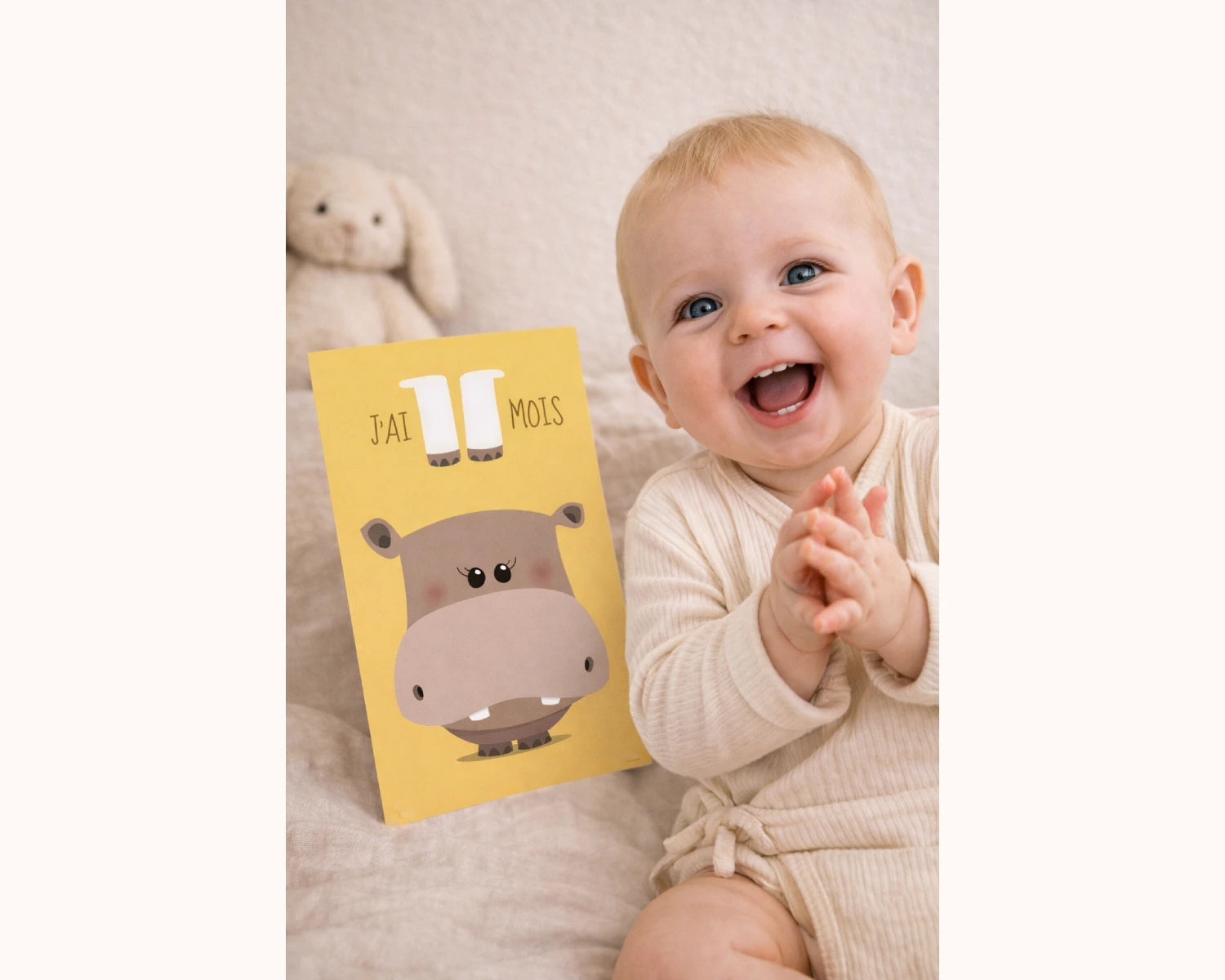 Ces cartes mois bébé deviennent un véritable journal de sa première année. Les illustrations présentes sur les cartes sont issues de ma collection d’animaux dessinés pour la décoration de chambre bébé.