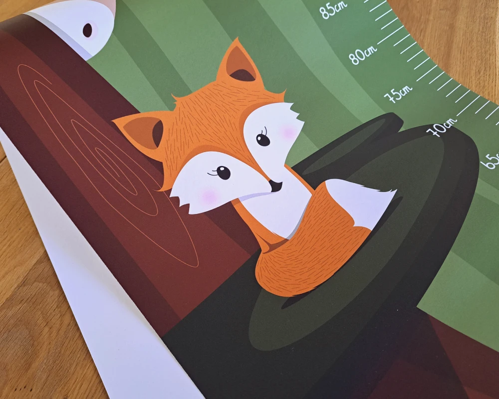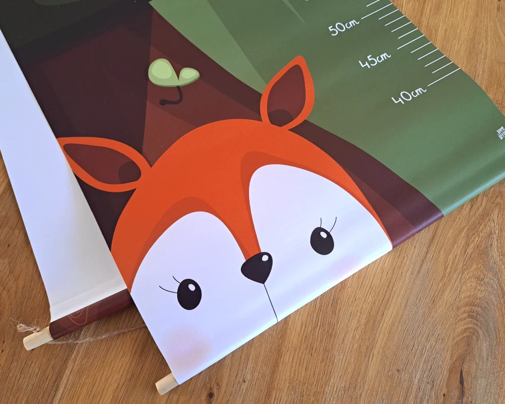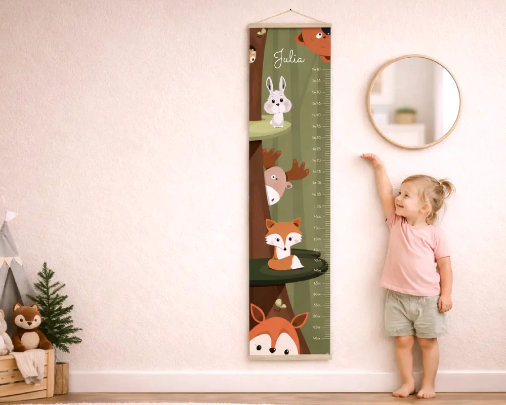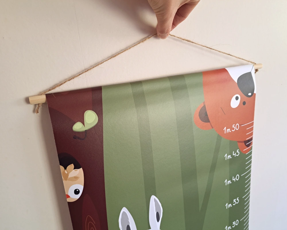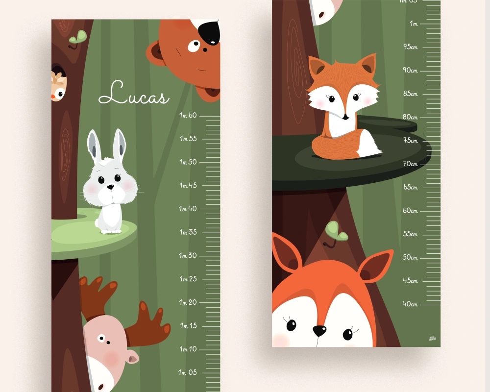 Les tons verts forêt structurent l’illustration et apportent profondeur et sérénité. Les nuances marrons et roux des animaux viennent réchauffer l’ensemble et créer un équilibre naturel et harmonieux. Cette palette soigneusement choisie permet à la toise de s’intégrer facilement dans une chambre bébé ou enfant tout en restant lumineuse et chaleureuse.