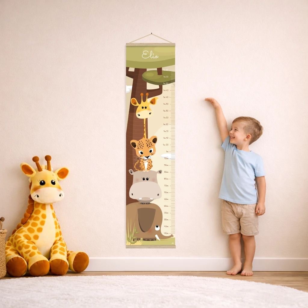 Apportez chaleur et fantaisie à la chambre de votre enfant avec cette toise murale savane chambre enfant personnalisée. Inspirée des paysages africains, elle transforme le mur en scène ludique où les animaux semblent jouer et s’équilibrer avec malice.