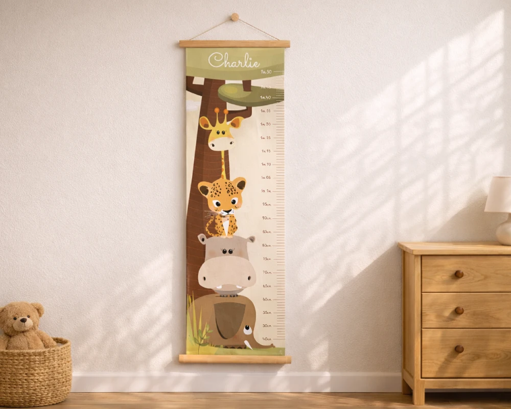 Ajoutez le prénom de votre enfant pour rendre cette toise murale savane encore plus unique.