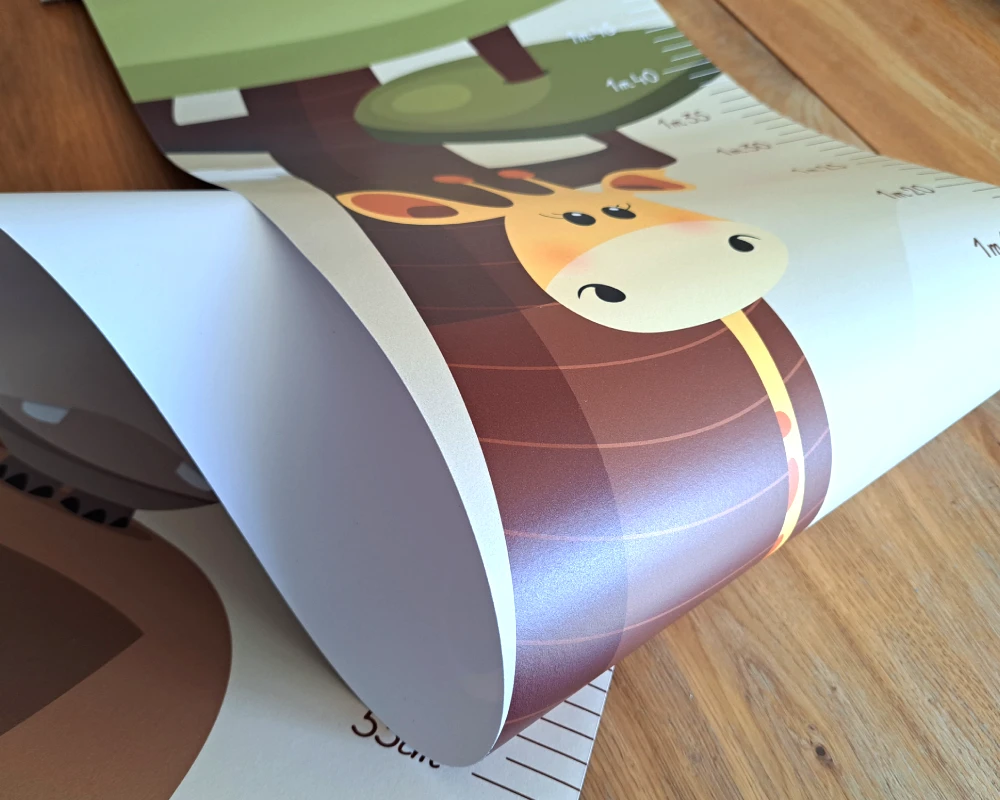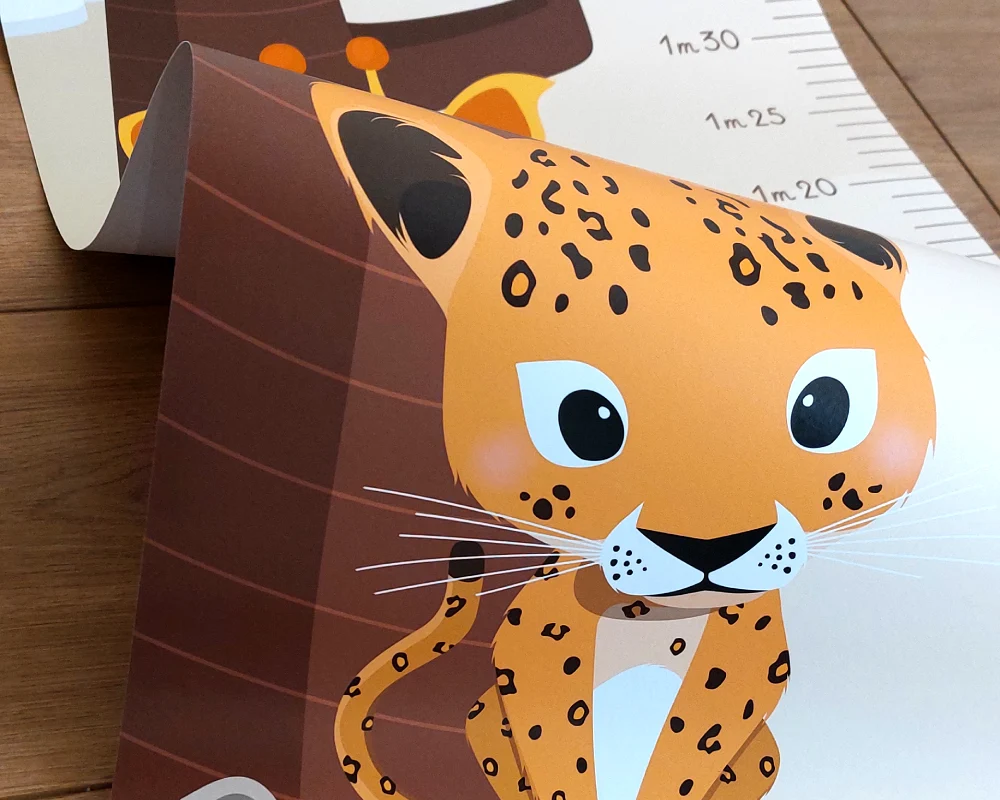Les proportions volontairement exagérées des animaux renforcent le côté fun et expressif de la toise. Elle ne se contente pas de mesurer : elle raconte une petite histoire, stimule l’imaginaire et donne vie au mur de la chambre